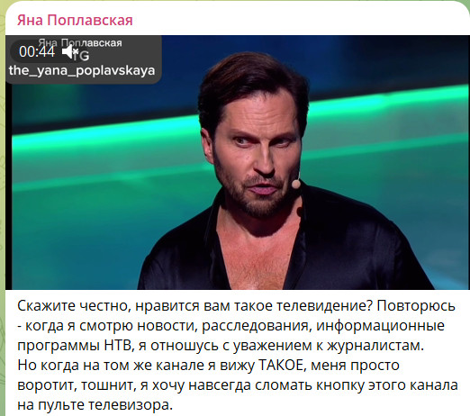 Поплавская понимает, что часто это необходимое зло, когда канал выпускает и такой контент, как "Звёзды", и профессиональные передачи. Однако в данном случае ей не хотелось бы участвовать в жизни НТВ.