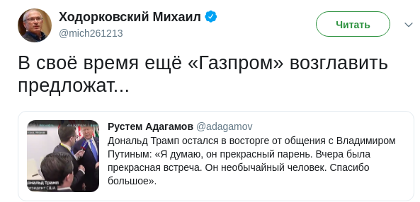 Бизнесмен не удержался от комментария и даже предложил для Трампа новую высокую должность. Но в России, предположив, что тому предложат возглавить "Газпром".
