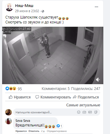 Пользователи интернета тут же наложили на видеозапись песенку Шапокляк из мультфильма про крокодила Гену: строки "Хорошими делами прославиться нельзя" и озорная музыка как нельзя лучше подошли этой комичной ситуации. Почему соседское имущество вызвало такой гнев старушки, пока неизвестно.