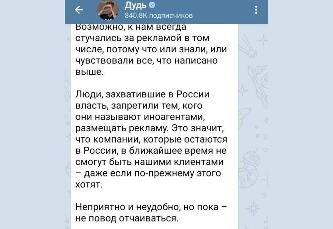 Наиболее распиаренный деятель либерального русскоязычного Интернета Юрий Дудь* держался едва ли не дольше всех. Но вот и он через запрещённые в России соцсети поделился печальными для себя новостями. Денег, конечно, меньше станет, признался Дудь* - но либеральный пропагандист пытается храбриться. Мол, в мире ещё достаточно бизнес-структур, юридически не связанных с Россией, - их будем рекламировать.