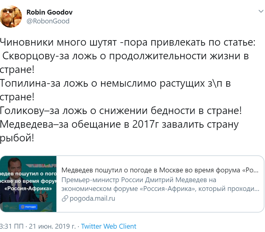 Жители России не поняли юмора в шутке премьер-министра Дмитрия Медведева о погоде." Хоть бы кто забрал тебя. Мы заплатим", - написал пользователь Twitter Sergey в Сети.