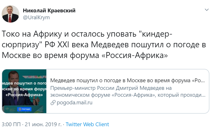 "Только на Африку и осталось уповать "киндер-сюрпризу" РФ ХХI века. Медведев пошутил о погоде в Москве во время форума "Россия - Африка", - отметил некто Николай Краевский