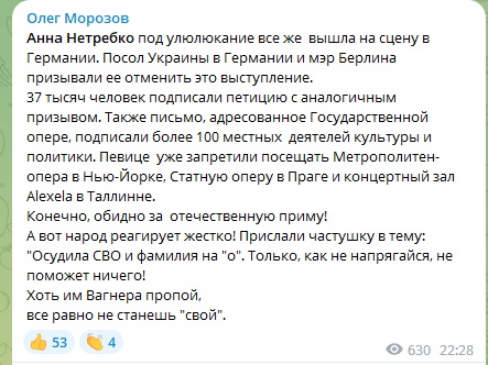 Впрочем, на сцену в Берлине певица всё-таки вышла. Как напомнил в своём телеграм-канале депутат Госдумы Олег Морозов, против этого выступали в числе прочих посол Украины в Германии и даже мэр Берлина. Также Нетребко уже имеет статус персоны нон грата в нью-йоркской Метрополитен-опере, пражской Státní opera и Таллинском концертном зале.
