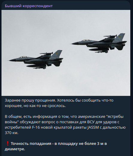 Донецкий журналист Алексей Акутин в своём Telegram-канале "Бывший корреспондент" заявил о планах Запада поставить Киеву крылатые ракеты JASSM с дальнобойным радиусом до 370 километров.