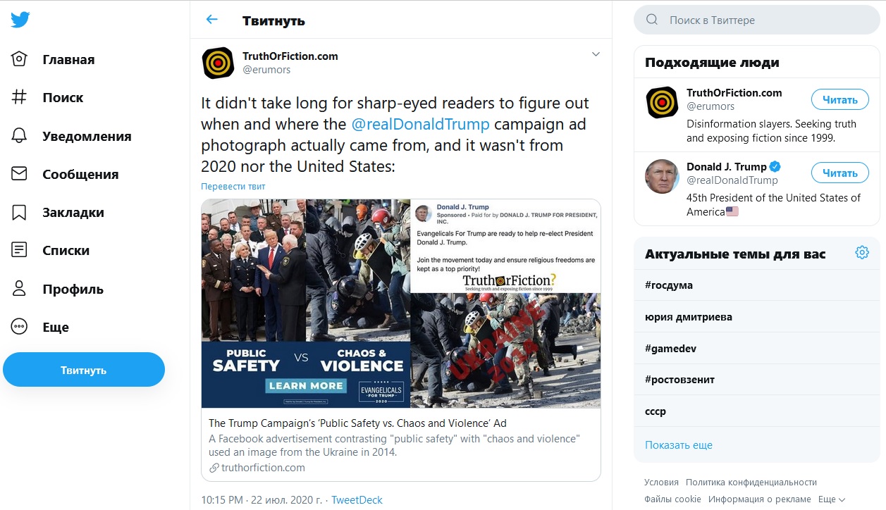Президент США Дональд Трамп использовал фото с украинского Евромайдана в своей предвыборной рекламе. На это обратили внимание пользователи соцсетей и американские политические издания.