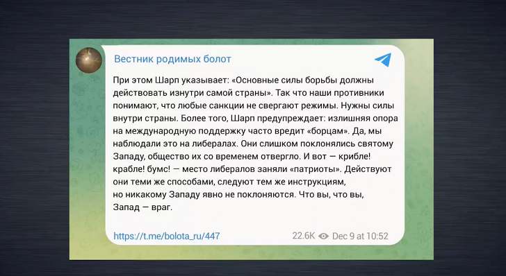 Но вопрос - а точно не понимают? Или это что-то другое? И вот здесь Михалков упомянул один труд, который принадлежит перу знаменитого американского политолога и теоретика "цветных революций" Джина Шарпа. Это книга о цветных революциях - "198 методов ненасильственных действий". То есть 198 способов довести ситуацию до смены власти в стране, до государственного переворота. И один из методов, который описывает Шарп, - это как раз политический траур и поклонение в местах захоронения. Вот, что об этом пишут авторы тг-канала "Вестник родимых болот" Максим и Ольга Духанины: