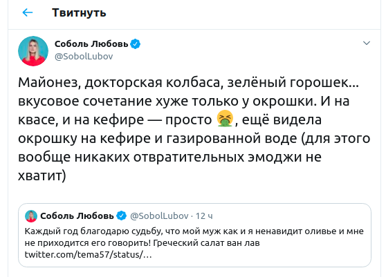 "Майонез, докторская колбаса, зелёный горошек... Вкусовое сочетание хуже только у окрошки, - отписала Соболь у себя в Twitter. - И на квасе, и на кефире - просто (эмоджи, изображающий рвоту), ещё видела окрошку на кефире и газированной воде".