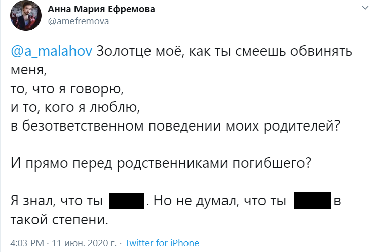 Золотце моё, как ты смеешь обвинять меня в безответственном поведении моих родителей? И прямо перед родственниками погибшего? Я знал, что ты ... (синоним слова "дурак"). Но не думал, что в такой степени, - пишет девушка в Twitter.