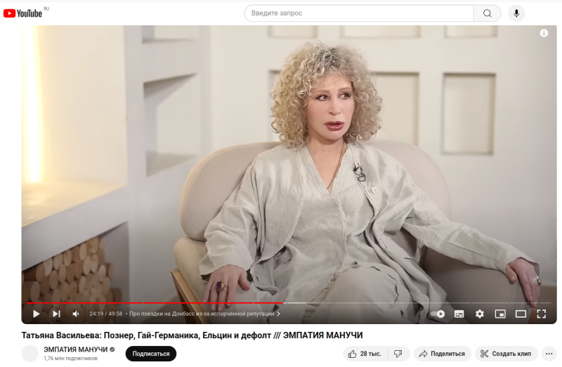 Схожего мнения придерживается и народная артистка России Татьяна Васильева. В интервью журналисту Вячеславу Манучарову для его программы "Эмпатия Манучи" артистка весьма негативно высказалась по поводу подобных поездок звёздной элиты в Донбасс.