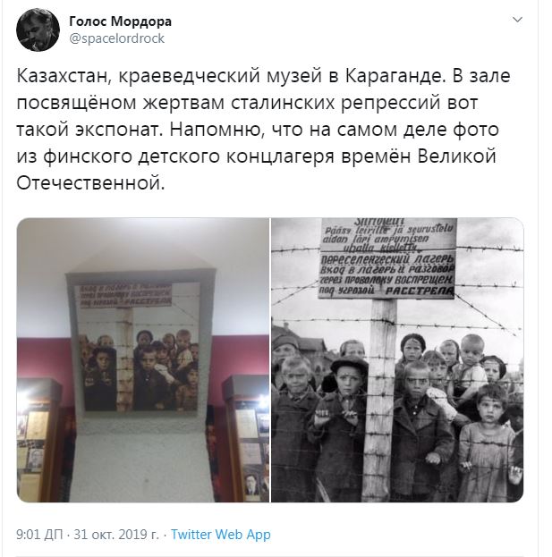 В посвященном жертвам сталинских репрессий зале краеведческого музея в казахстанской Караганде посетителям демонстрируется в качестве экспоната фотография, на которой запечатлены дети за колючей проволокой. Однако, указывают пользователи, на самом деле это фото из финского детского концлагеря времен Великой Отечественной.