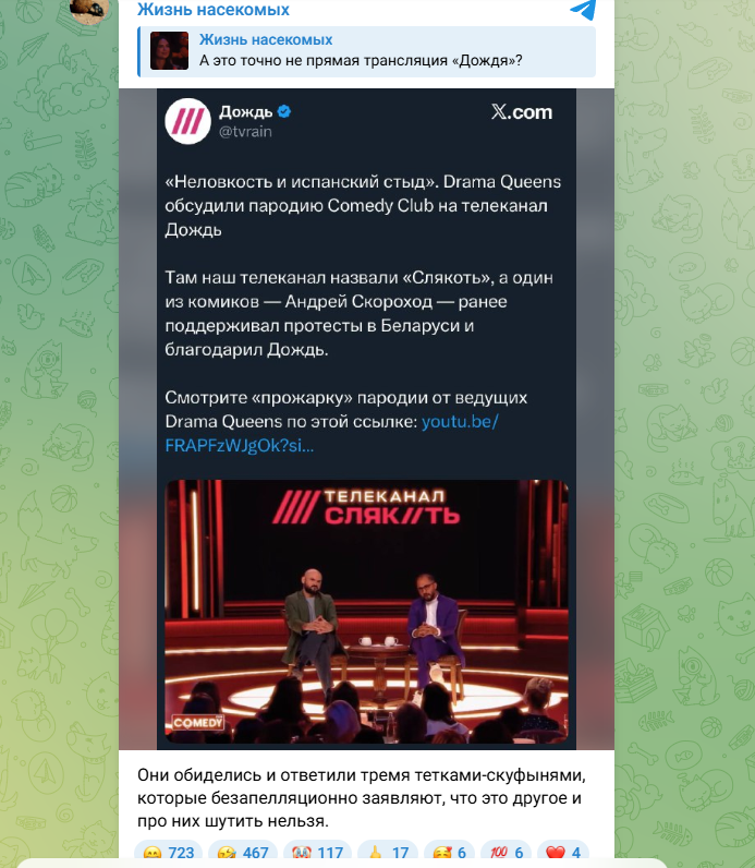 В телеканале "Слякоть" себя опознал беглый "Дождь"*, о чём тут же оповестил либеральную – и не только – общественность. Классическое, идеальное "это другое". Либеральные журналисты очень обиделись, что про них сняли пародию, и попытались уколоть одного из комиков.