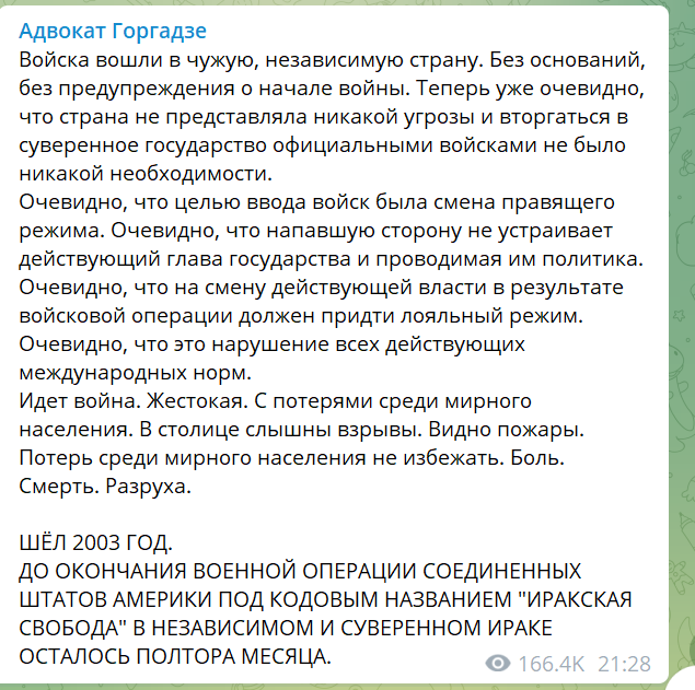 "Войска вошли в чужую, независимую страну. Без оснований, без предупреждения о начале войны", - так начинается новый пост в телеграм-канале известного адвоката Шота Горгадзе. Либералы уже наверняка начали потирать руки в уверенности, что именитый юрист "переметнулся" на их сторону и теперь тоже будет вопить о "вторжении России".