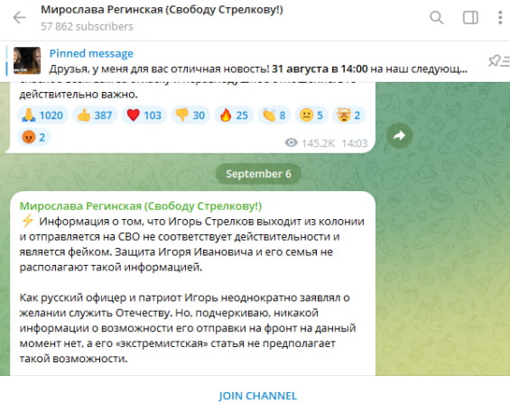 При этом супруга бывшего министра обороны Донецкой Народной Республики (ДНР) Мирослава Регинская в "Телеграме" выступила с опровержением. По её словам, информация о том, что Игорь Стрелков выходит из колонии и отправляется на СВО, - фейк.