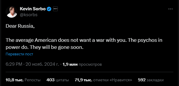 И вот теперь, после того как Белый дом выдал Киеву разрешение бить по России дальнобойными ракетами, Сорбо снова не стал молчать. На своей странице в соцсети он написал, что обычные американцы не желают враждовать с русскими. Конфликт раздувают те, кто сейчас у руля власти в Америке, и их Сорбо откровенно назвал "психи у власти".