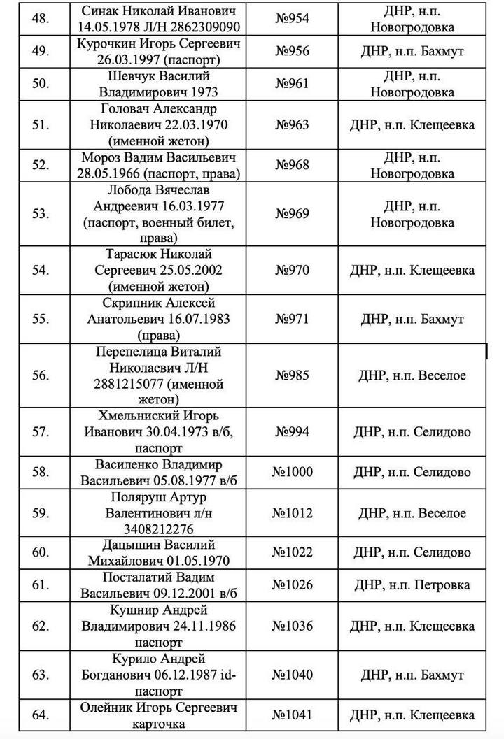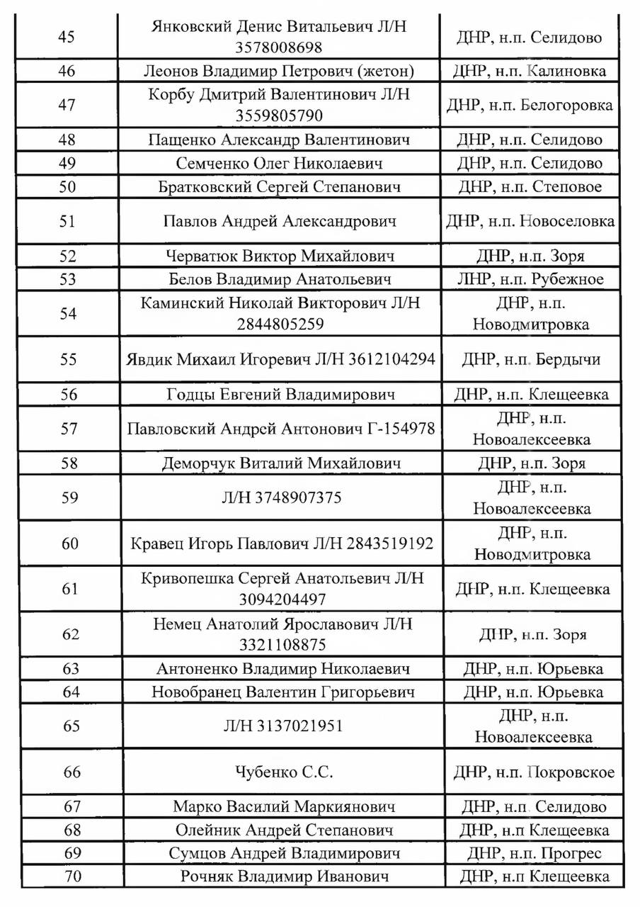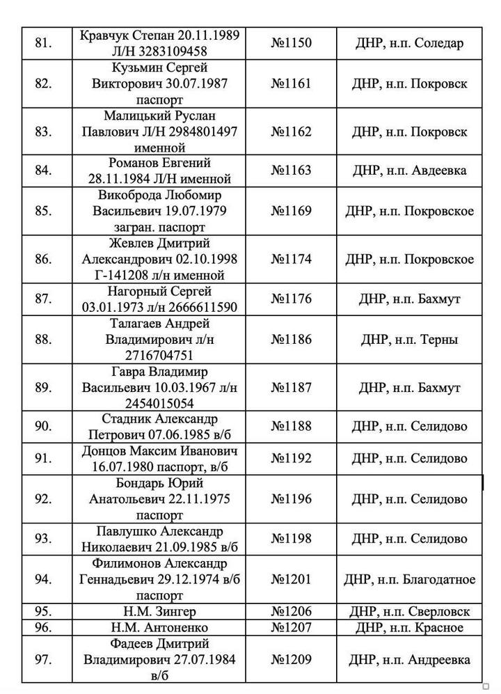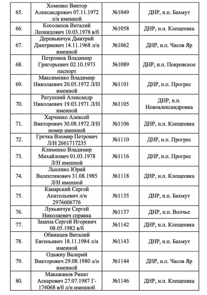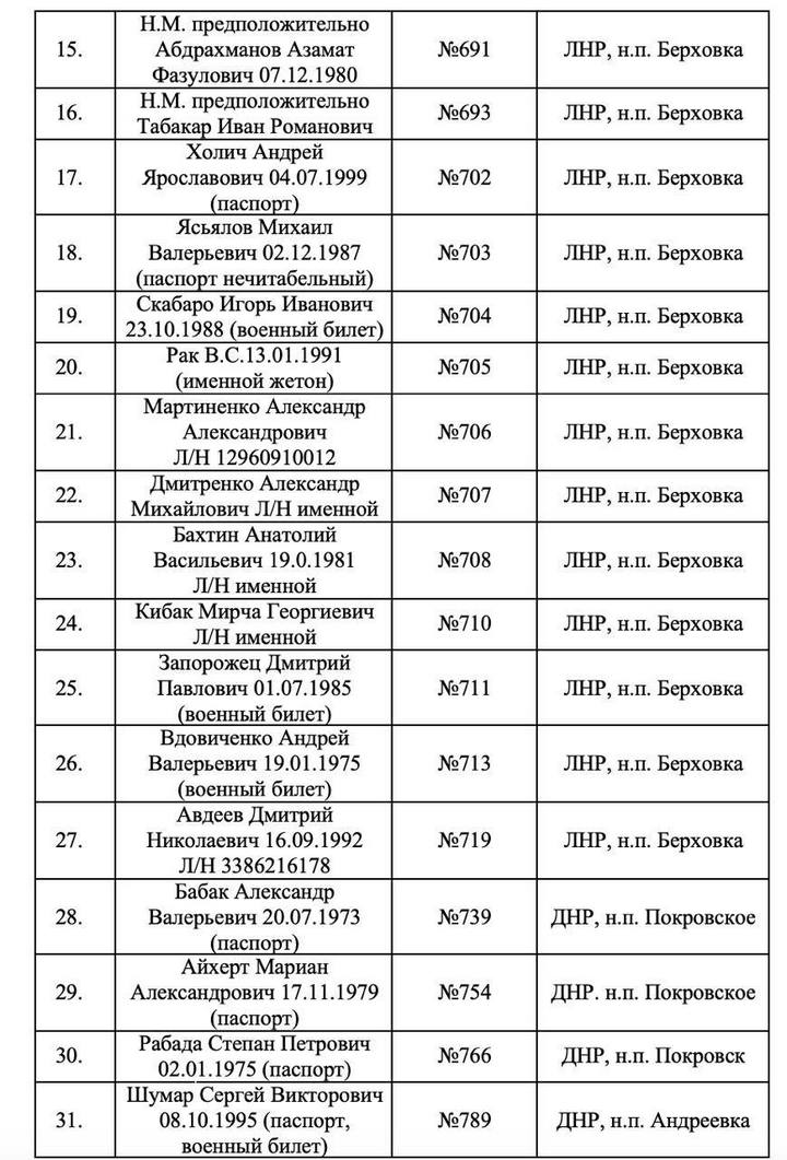 Евгений Балицкий отметил, что украинцы имеют право знать судьбу своих родных и близких. Поэтому он начал публиковать списки имен погибших, которые были направлены для передачи Украине. В списках, которые опубликовал Балицкий, 97 имен солдат ВСУ, которые были опознаны. Рядом с каждой фамилией указаны документы,по которым идентифицированы личности погибших, а также номера пакетов, в которых они находятся.