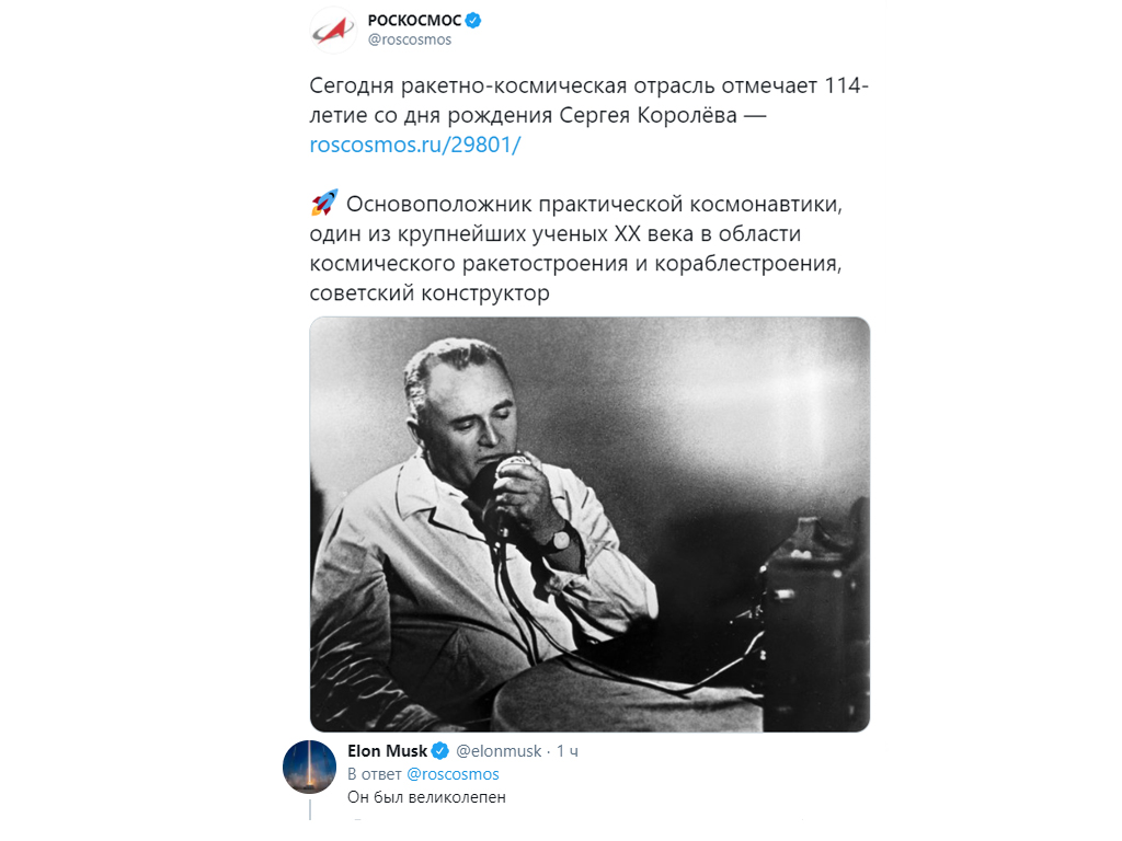 "Он был великолепен", - тремя русскими словами оценил вклад Королёва в космонавтику Илон Маск. Рогозин, кстати, слова Маска уже прочёл.