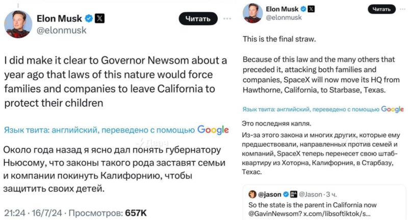 Для многодетного отца Илона Маска, придерживающегося традиционных взглядов, это стало последней каплей. И он объявил о переводе компаний SpaceX и X в другой штат.