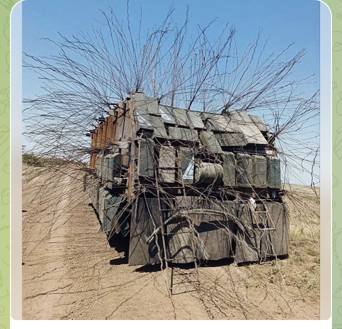 На снимке изображен БТР с массивным защитным сооружением в виде стального навеса, который в публикации иронично назван "царь-мангалом". Эта конструкция полностью скрывает базовую платформу, делая невозможным идентифицировать исходную модель машины. В сообщении подчеркивается, что это пример адаптации техники ВС России к реальным условиям боевых действий, а не демонстрационный образец.