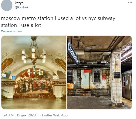 Иностранные интернет-пользователи сравнили станции метро в Москве и Нью-Йорке. Они обратили внимание, как выглядит "подземный дворец" из столицы России и станция подземки в американском мегаполисе. Сравнение оказалось не в пользу США. "Как из фильма про конец света..." - написали пользователи Twitter.