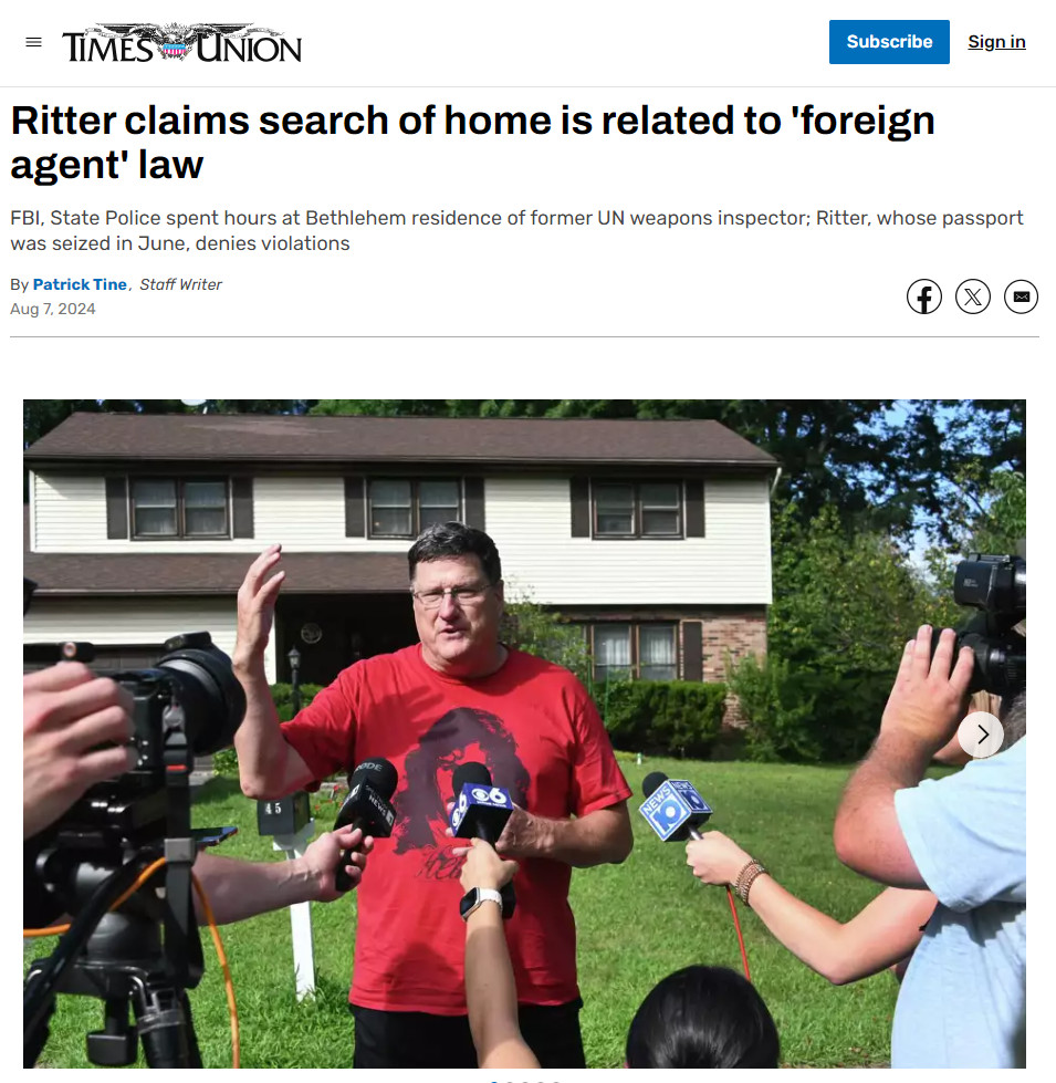 В доме бывшего американского разведчика Скотта Риттера в Нью-Йорке агенты ФБР провели обыски. Их точная причина пока неизвестна.
