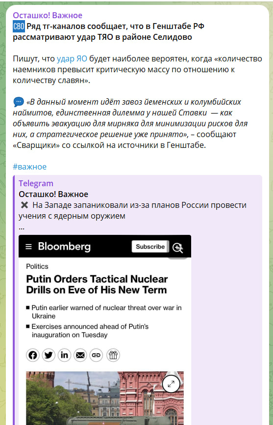 Ряд инсайдерских Tg-каналов сообщает со ссылкой на источники в Генштабе, что Россия готова применить тактическое ядерное оружие в районе Селидово (Покровский район, ДНР).