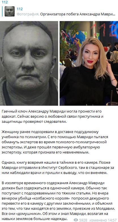 По одной из версий, гаечный ключ, с помощью которого Александру Мавриди удалось сбежать из ИВС, принесла его адвокат. Следователи полагают, что между ней и её подзащитным есть любовная связь.