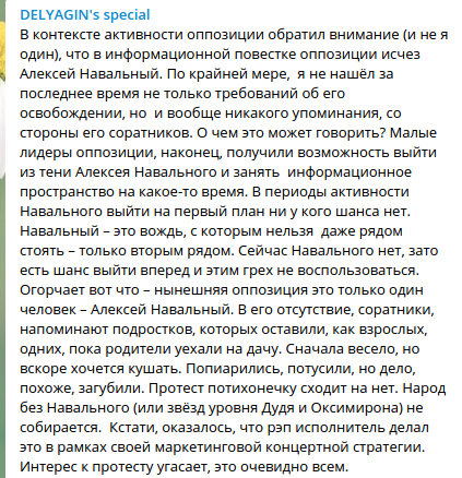 "В информационной повестке оппозиции исчез Алексей Навальный, - озадачил Делягин. - По крайней мере, я не нашёл за последнее время не только требований о его освобождении, но и вообще никакого упоминания со стороны его соратников".