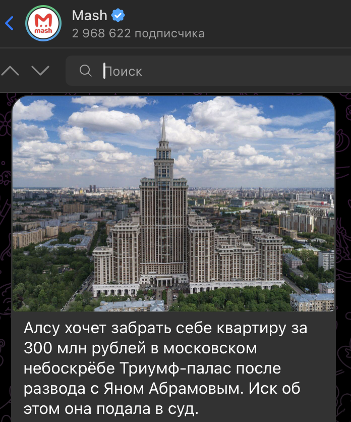 Ранее Абрамов предлагал певице сумму в 2,5 миллиарда рублей в качестве компенсации, но она отказалась от этой сделки. По словам адвоката Абрамова, Александра Добровинского, изначально Алсу требовала только одну квартиру в "Триумф-паласе" стоимостью 300 миллионов рублей. Однако вскоре она изменила свою позицию и представила более масштабный список требований.