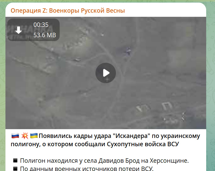 Тем временем в сети расходится видео, на которых запечатлён момент удара. Телеграм-канал "Военкоры русской весны" пишет, что в результате красивой работы "Искандера" противник лишился порядка 70 солдат. Сам полигон находится у села Давидов Брод на Херсонщине.