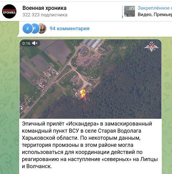 Аналитики "Военной хроники", комментируя эпичный прилёт "Искандера" в замаскированный командный пункт ВСУ в селе Старая Водолага Харьковской области, сообщили, что, "по некоторым данным, территория промзоны в этом районе могла использоваться для координации действий по реагированию на наступление "северных" на Липцы и Волчанск".