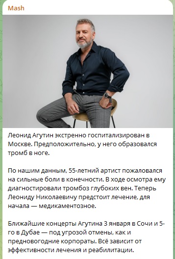 Незадолго перед этим Агутин жаловался на сильную боль в ноге. Осматривавшие его медики пришли к выводу, что у певца образовался кровяной сгусток в сосуде. И поставили диагноз: тромбоз глубоких вен нижних конечностей.