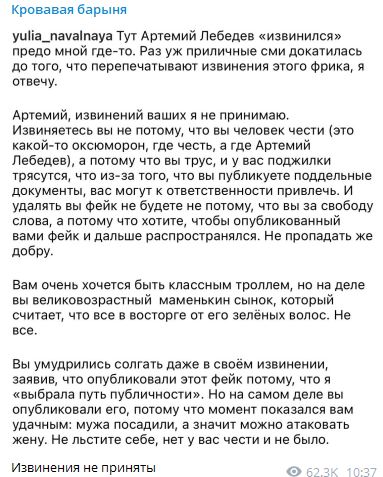 Юлия назвала Лебедева "трусом", который в своих извинениях руководствуется не честью, а страхом быть наказанным за фейк. Она также добавила, что он является не "троллем" (как сам назвал себя Артемий в своём обращении), а "маменькиным сынком" с зелёными волосами.