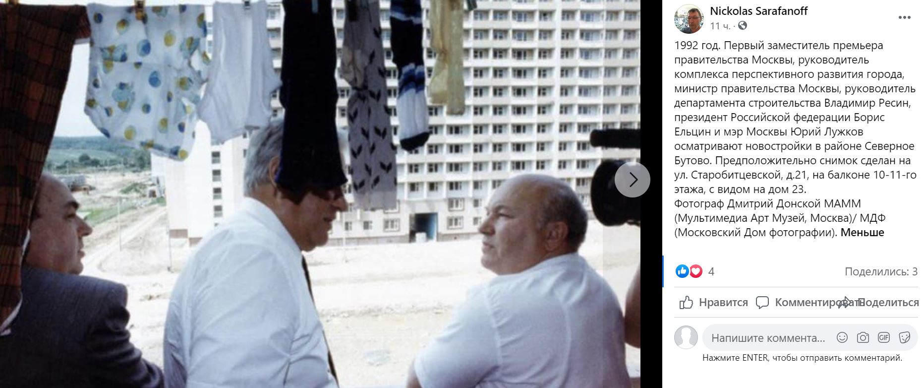 Пользователь Facebook Nickolas Sarafanoff выложил редкое фото, которое позволяет взглянуть на первого президента России "в быту". На снимке, сделанном в 1992 году, Ельцин стоит на балконе жилого дома рядом с экс-мэром Москвы Юрием Лужковым, а также бывшим главой Департамента строительства Москвы Владимиром Ресиным и осматривает новостройки в Северном Бутове.