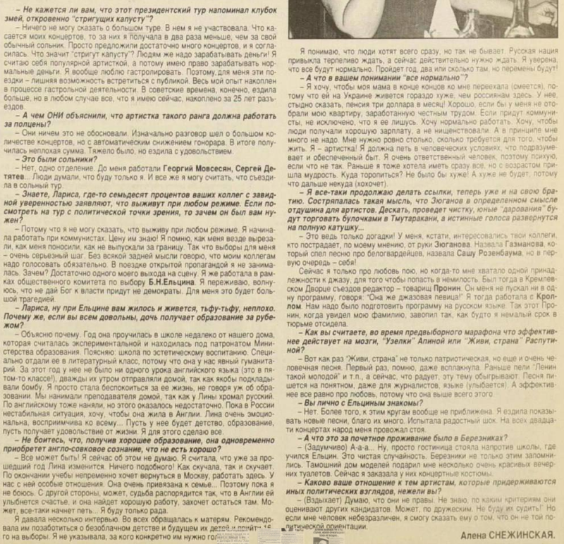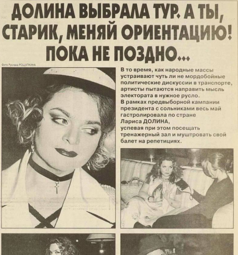 И тогда технологи кампании пустилась во все тяжкие и решили организовать большой тур звёзд отечественной поп-сцены в поддержку демократического кандидата. Брали всех, до кого могли дотянуться. Были тут и молодёжные певцы, и рокеры, о попсовики со стажем. Удар наносила по всем возможным группам населения. Многие из звёзд давали интервью газетам и рассказывали, почему решили поехать в тур поддерживать Ельцина. Истории у них были все как под копирку – придут "страшны коммунисты", и всё отнимут. Не обошлось и без Ларисы Долиной, пытавшейся в те годы сделать себе респектабельное имя.
