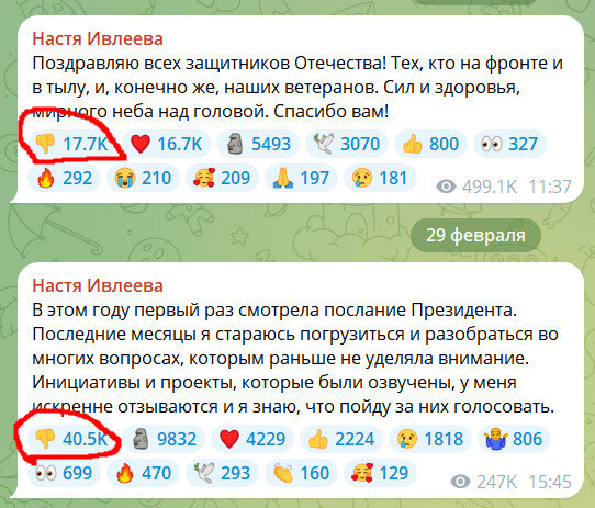 Но даже её подписчики уже не верят. В посту про "защитников Отечества" дизлайки набрали более половины реакций, а про "инициативы и проекты" - более 80 %.