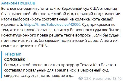 Так Пушков прокомментировал решение Верховного суда США отклонить иск прокурора Техаса, который потребовал признать недействительными выборы в четырёх колеблющихся штатах.