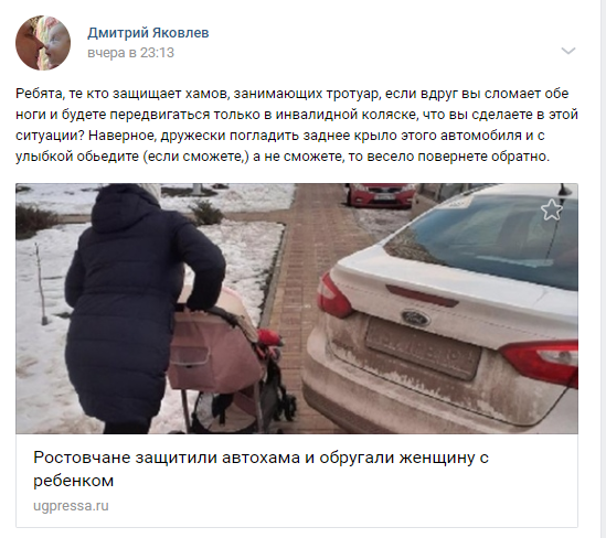 Молодая мама из Ростова-на-Дону, которой пришлось по снегу объезжать с коляской припаркованную на тротуаре машину, рассказала о случившемся в соцсетях. Но вместо того чтобы поддержать женщину и осудить нарушителя, ростовчане встали на сторону автохама.