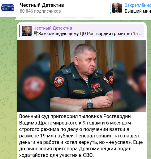 На СВО попросились ещё до вынесения им приговора суда и бывший заместитель командующего Центральным округом Росгвардии по тылу Вадим Драгомирецкий и его подчинённый из управления приёмки подполковник, боевой офицер Эльдар Гаджиев. Газета "Коммерсантъ", ссылаясь на слова адвоката, уточнила, что оба офицера подали на имя следователя ходатайства об участии в СВО и рассчитывают на их удовлетворение.