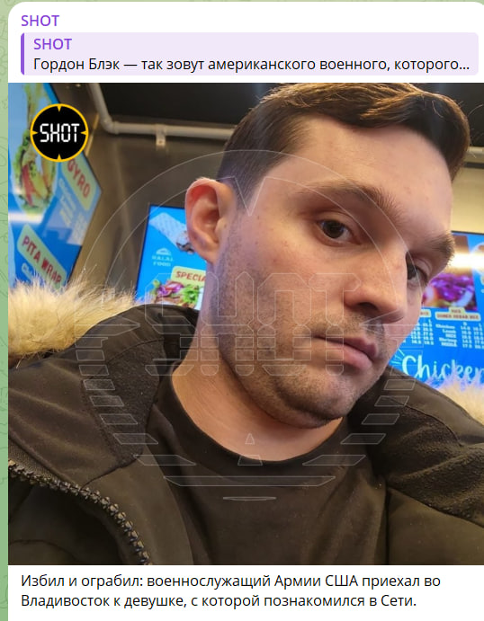 Гордон Блэк - американский военнослужащий, который служил на военной базе США в Южной Корее в должности штаб-сержанта, задержан во Владивостоке. Как сообщает SHOT, Блэк должен был вернуться в Техас для прохождения дальнейшей службы в Форт Кавазос. Однако каким-то образом очутился в России, не уведомив своё командование.
