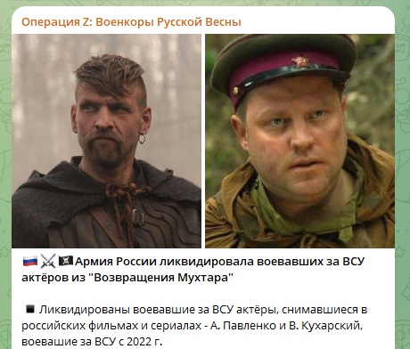 На Украине погибли воевавшие на стороне Киева актёры Павленко и Кухарский. Павленко вступил в ВСУ в июне 2022 года, Кухарский примкнул к боевикам в том же году.