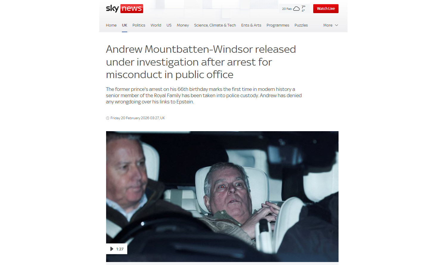 19 февраля 2026 года, в день 66-летия, Эндрю был задержан и доставлен в полицейский участок. Он провёл там около 12 часов.