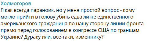 Я, как всегда, параноик, но у меня простой вопрос - кому могло прийти в голову убить едва ли не единственного американского гражданина по нашу сторону линии фронта прямо перед голосованием в конгрессе США по траншам Украине? Дураку или всё-таки изменнику?