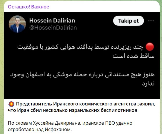 Опять же по данным СМИ, ядерные объекты в иранской провинции Исфахан не пострадали, они находятся в полной безопасности. Такие данные обнародовало агентство Tasnim, указав, что никаких происшествий на объектах ядерной инфраструктуры не зафиксировано.