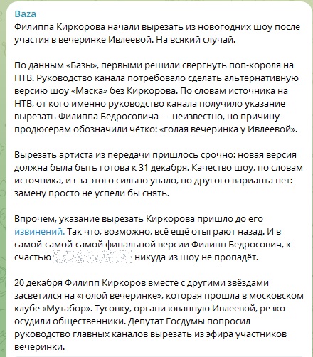 И такое вполне может случиться. Как сообщает телеграм-канал Baza, одного из "тяжеловесных" участников вечеринки, Филиппа Киркорова, уже начали убирать из новогодних эфиров. Руководство телеканала "НТВ" якобы поручило сделать новую версию программы "Маска", вырезав из уже отснятого материала певца. При этом продюсерам внятно объяснили, что это связано именно со скандальной "голой вечеринкой".
