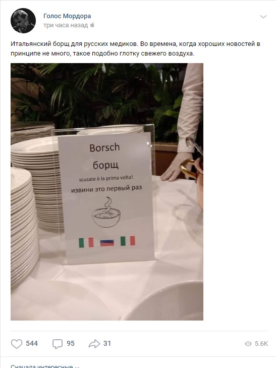 Чтобы поддержать российских военных медиков, которые сегодня работают в Италии, местные повара приготовили для наших борщ. А подавали суп с трогательной запиской: "Извини, это первый раз".