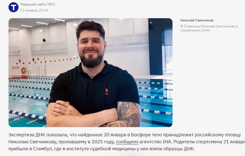 Конспирологические теории в очередной раз с треском провалились. 20 января стало известно, что из моря вытащили тело в гидрокостюме – предположительно, Николая Свечникова. Родные мужчины вылетели в Турцию.