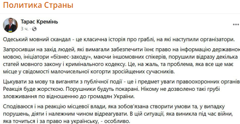 На данный инцидент уже отреагировал так называемый "мовный" омбудсмен Тарас Креминь. Он обвинил ведущего в том, что тот "нарушил сразу несколько статей языкового закона и уголовного кодекса" - просто самим фактом разговора на русском языке. Креминь пообещал наказать мужчину.