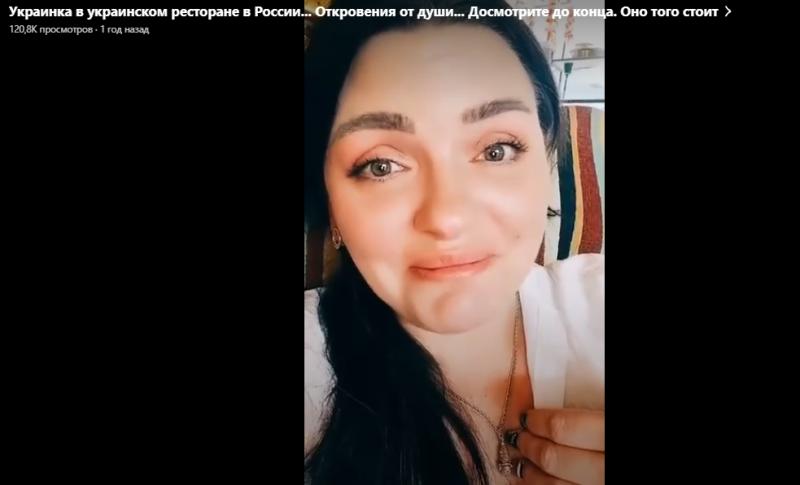 На этот раз украинка записала видео из украинского ресторана. Она отметила, что увидела там кусочек родной земли, где дадут и сала, и цибули (лук - укр.). Девушка перешла на украинский язык и заявила, что в России можно спокойно говорить на "ридной мове" и не ловить косые взгляды.