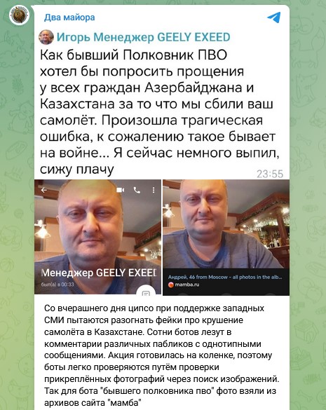 Так для бота "бывшего полковника ПВО" фото взяли из архивов сайта "Мамба". Параллельно украинские и западные СМИ пишут о том, что такая версия "весьма вероятна". Целью атаки являются как россияне, так и жители Казахстана и Азербайджана. Враг пользуется любыми возможностями, чтобы подрывать авторитет нашей страны,