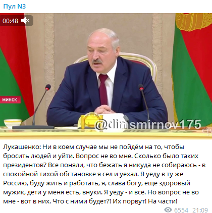 Такое заявление лидер страны сделал в интервью политическим обозревателям Белоруссии и зарубежья. Президент подчеркнул, что никто не мешает ему уехать в Россию и жить там в тихой и спокойной обстановке вместе с детьми и внуками, но его останавливает забота о народе.